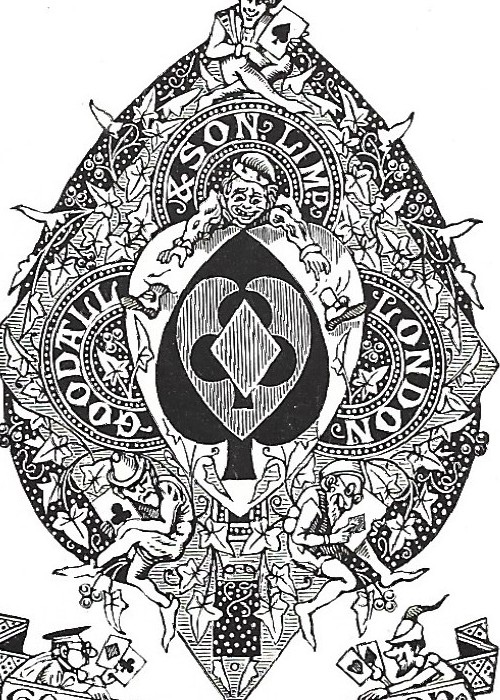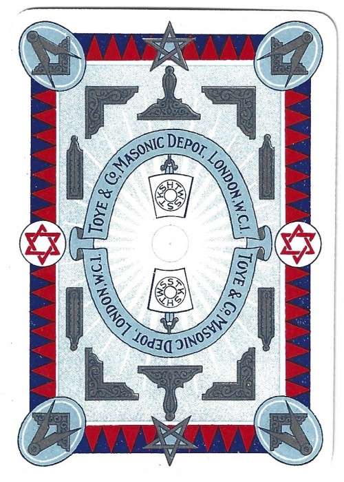 52 cards and 1 joker made by Chas Goodall & Son between 1897 and 1921. Dated by the Ace design. The set was made for Toye & Co Masonic Depot. The cards are in a paper wrap with a blank back. There are some letters in circles on the card: HTWSSTKS. This is an acronym with connections to the Masonic Temple, specifically Royal Arch Masons. The letters stand for, “Hiram, Tyrian, Widow’s Son, Sent to King Solomon.” All third degree Freemasons study the story of a man named Hiram Abiff (a.k.a. Hiram the Widow’s Son.) According to legend, Hiram was chief architect for the Temple of King Solomon. When bad guys tried to squeeze the secret masonic passwords out of Hiram, he valiantly refused to tell them. As a result, the bad guys killed poor Hiram. In Masonic teachings, Hiram’s story is held up as an example of loyalty.