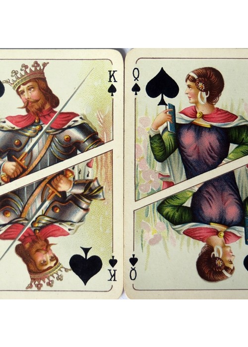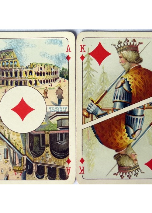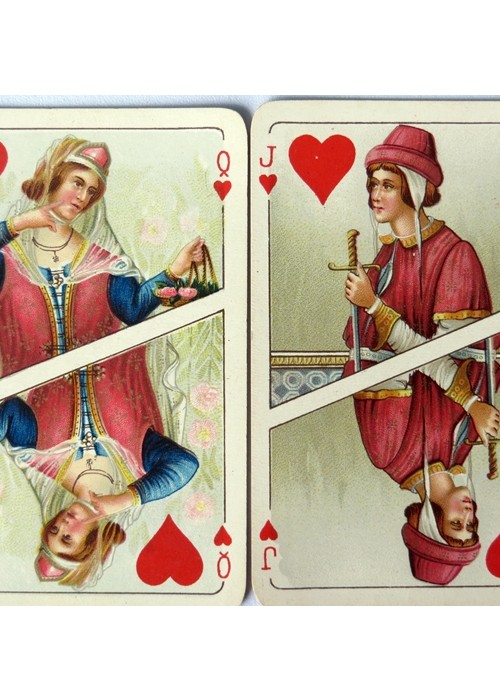 Cards made by Piatnik c.1923, celebrating 13th century Italy. These cards are commonly known as the “Dante and Beatrice” cards, because the backs of the cards in some of the decks feature a portrait of Dante or that of Beatrice, Dante’s muse. The backs of the cards in the deck here listed have the portrait of Dante, a portrait that appears to have been taken from a famous portrait of Dante attributed to Giotto in the chapel of the Bargello Palace in Florence. The deck features scenic Aces of historical locations in Italy and court cards with a look appropriate to the late middle ages. The deck has 52 suited cards, plus 1 Joker, plus 1 card announcing the deck. The cards are large and wide, measuring 95mm x 65mm, with gold gilt around. Reference: Fournier, Playing Cards, Italy 115