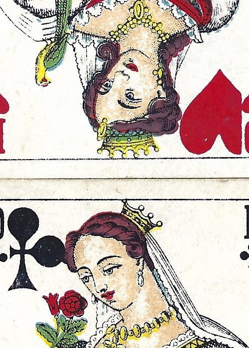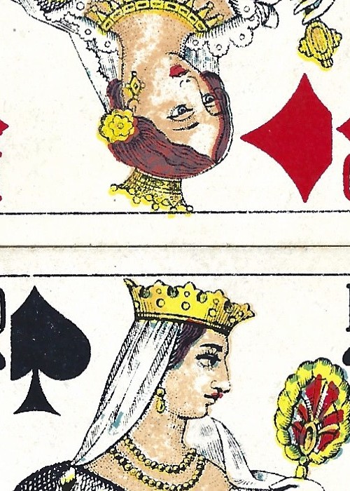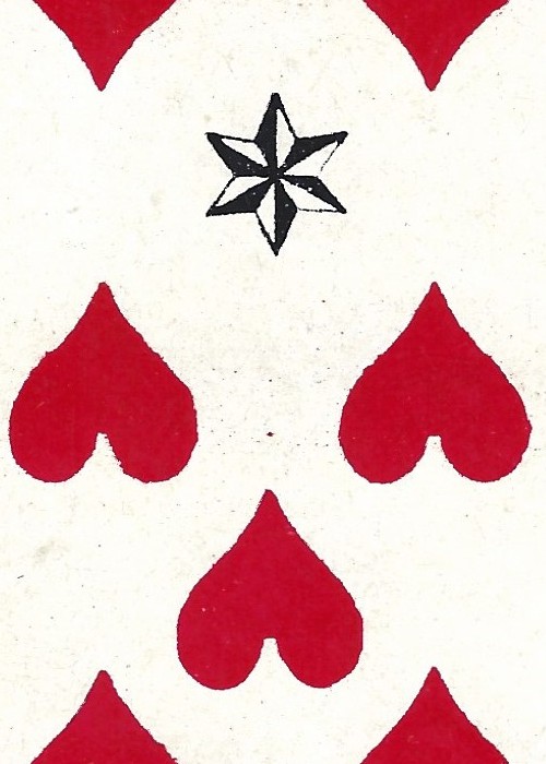 German deck, dating from around 1940. 52 cards and 2 Jokers. Pips are Hearts, Clubs, Diamonds, Spades. The translation from the front is: Bridge, Rummy, Whist. French Picture (meaning the design on the front of the cards) No 11, 54 cards, Matched back. On the side of the box its says, Mit Goldecken, meaning with gold corners, though there is no trace of this on the cards. The box is wrapped in a UK tax duty wrapper of C Goodall & Son, the design of which dates to 1940. These cards were made by the Belgium Turnhout-based cardmaker Leonard Biermans, during the Nazi-occupation of Belgium, from May 1940 until September 1944 for the German market. Turnhout was freed from the Nazi’s by the Polar Bears Regiment on September 24th. One can immediately see that it’s an ‘occupation-deck’ by the ‘Wüst’-star on the box, and that you’ll also find on the 7 of hearts. The images on the cards themselves are indeed ‘Dutch’, and not ‘French’, so there is some rebellion in these cards against the Nazis. The wrapping of a UK tax paper is unlikely to have been round these, unless they were resold in the UK after the war. (With grateful thanks to Stefan Lauwers and Pedro Bouca for their amazing detective work)