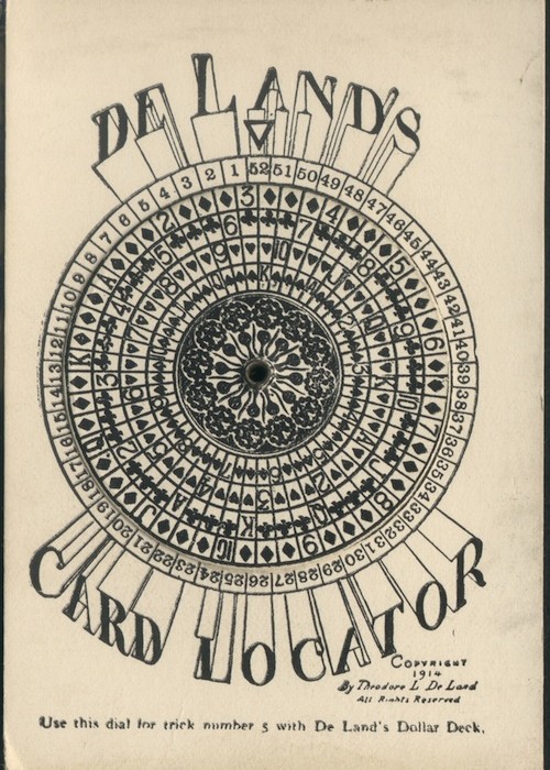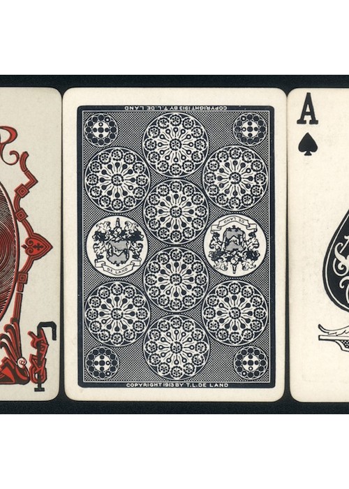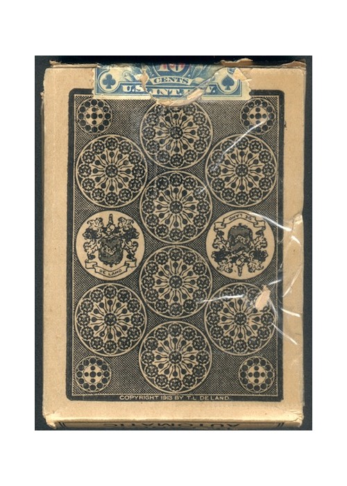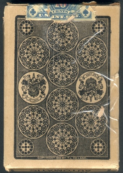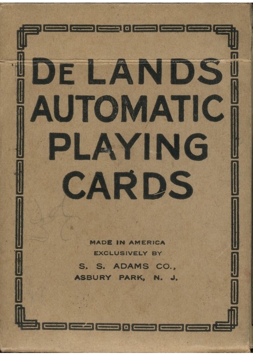 Actually first called De Lands Dollar Deck, after the creator Theodore De Land, from the time it first appeared on the market in May 1914 until the end of 1918. SS Adams then started publishing the deck in early 1919, with the title Automatic Playing Cards. It was sold under that title until sometime in 2009 when Magic Makers bought SS Adams and changed the title to DeLand’s 100 Dollar Deck. The faces of the cards are standard modern now. Besides being stacked, marked and stripped, the back of each top card shows you what the bottom card is, the locations of all the cards of a specific suit, how many cards have been cut off the deck, how many cards are left on the table after the deck is cut, and much more. The clocks on the card backs carry a lot of info. This particular deck has 1941 for the cancellation date on its tax stamp, but the 10 cent tax stamp was only used until 1940 so the deck was actually made earlier.