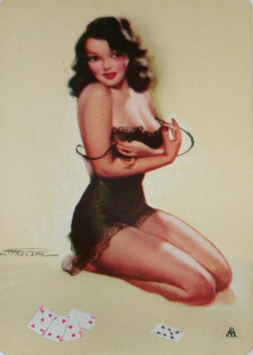 “Win, Lose or Draw,” the double bridge-sized deck set featuring art by Earl MacPherson and manufactured by Brown & Bigelow in 1945, was a sensation at the time and remains one of the iconic pin-up decks of the golden age. It reportedly sold 168,000 orders in just four months. Luckily for the contemporary collector, this also means full decks with original packaging and including the 1945 calendar card are relatively plentiful on the secondary market. The set came in a box that is designed to look like a vintage book; no doubt many of these sets went undetected while shelved between real books. There is a poem on the inner box as well as a different one on the joker. The poems and images, taken together, tell a story; the brunette is pictured on one card as drawing unsuccessfully to a straight flush, and is resignedly taking down her shoulder straps. The same girl on the second deck, though topless, is more confident as she boldly draws a hidden ace of hearts from her waistband. Unlike similar Brown & Bigelow projects of the era, the cards themselves are not printed with promotional advertising, but the outer box is embossed with the custom promo copy.