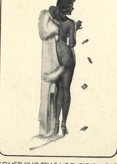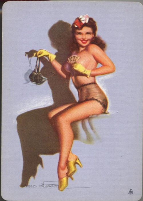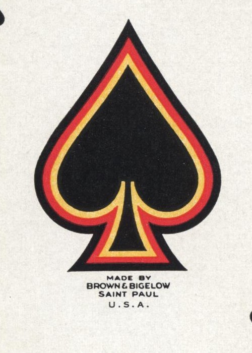 After the success of the “Win, Lose or Draw” 2-deck set of 1945 featuring the pin-up art of Earl MacPherson, Brown & Bigelow published a double bridge deck set in 1946 titled “Not According to Hoyle,” again featuring MacPherson’s artwork. As in the previous set, the promotional advertising is printed on the outside box, while the card backs bear no ad copy. This time there are two different models, a blonde and a brunette, but the card playing theme continues, as each girl holds a 5-card poker hand. A new joker design with a new poem is featured, and a calendar card from 1946 is included (on the calendar card, the ad copy from the outside box is reproduced). As with the earlier “Win, Lose or Draw” set, enough copies of “Not According to Hoyle” were sold and distributed that 75 years later the secondary market for this collector piece is strong. Note: (a) As with the listing of the earlier set, each deck is delineated separately here to account for collectors who may have one surviving full deck but not the other. (b) My outside box has some damage, so I am using a different web-sourced cover image here for accuracy, and am including my scanned deck as is for the gallery. (c) This set uses the more familiar B&B spade ace design, while the set from 1945 uses the 3 colored Minnesota loon design (at least in my copies). The blonde spade ace adds the initials R.I. below, the brunette does not.