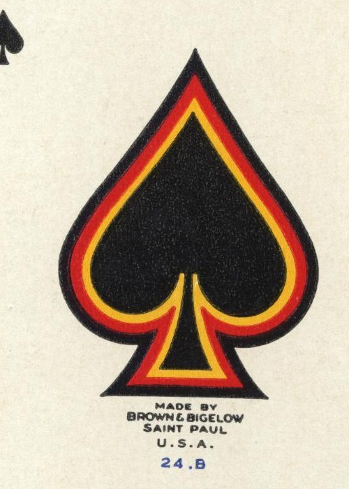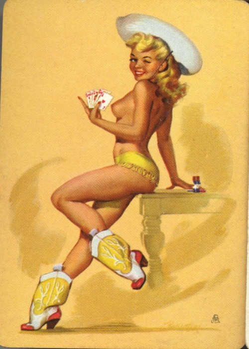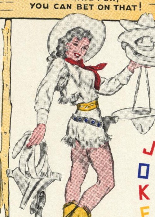 The 1947 double bridge deck set “Quick on the Draw” was not the biggest success of artist Joyce Ballantyne’s career; that honor would go to her painting of a three-year-old Coppertone girl and a small dog, one of the most famous advertising images of the 20th century. This Brown & Bigelow set with card-playing cowgirls sold in great numbers, though, which means there are many of them still around. (Some sources date the decks as late as 1953, but since there are calendar cards as early as 1947, that cannot be accurate.) This set is similar to the 1945 and 1946 sets of Earl MacPherson art, in that the ad copy is on the outside box, leaving the card backs as a full image, and that the joker has custom artwork and a saucy poem. The cowboy hat sticker on the box has a soft felt feel. (As with the listings of the earlier sets, each deck is delineated separately here to account for collectors who may have one surviving full deck but not the other.)