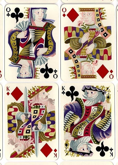 The first edition of this two-deck set was released in 1948. It can be distinguished from future editions in that the individual deck box is labeled 53 cards and the suit symbols on all court cards are shown in full.