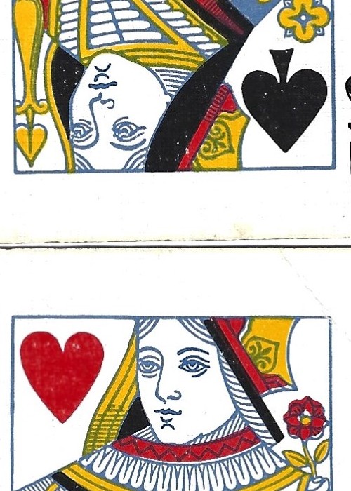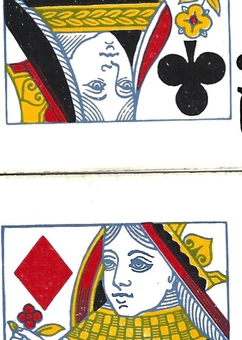 52 card deck and 2 jokers, made by Waddingtons, with Goodalls jokers and a De La Rue Ace of Spades. Made between 1950-55.