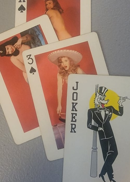 Vintage – 1950 – 1960’s Fifty-Two Art Studies Nude Pin-Up Playing Cards These are The 1954 Original WP Fifty-Two Art Studies Cards, Made in the USA and distributed by Novelties MFG, & Sales Corp., St. Louis, MO. They are also all plastic coated to protect the cards. Original Deck has 54 Cards. (13) Playing Cards of each Suit (Hearts, Diamonds, Clubs & Spades), for (52) + (2) Jokers. The main Joker Card features a Photographer, in a Black Beret and Reds Checked Overcoat, standing behind a large Box Camera on a tall Tripod. The “Extra” Joker has an introduction that reads: “ For the Approval of the discriminating Artist and connoisseur of art, Fifty-Two separate and Distinct Studies. These are examples of modern photography at its finest and should prove invaluable in discussions, forums, etc. ”, followed by a guarantee statement. These are standard size playing cards and the Front of each individual card has a FULL COLOR Photograph of a Nude Pin-Up Model of the 1940s & 1950s (including Betty Paige ). The Back of each card has a colorful rendering featuring the likeness of a vintage camera. It has a red Background with (2) Camera Lenses, complete with numbers of each lens.