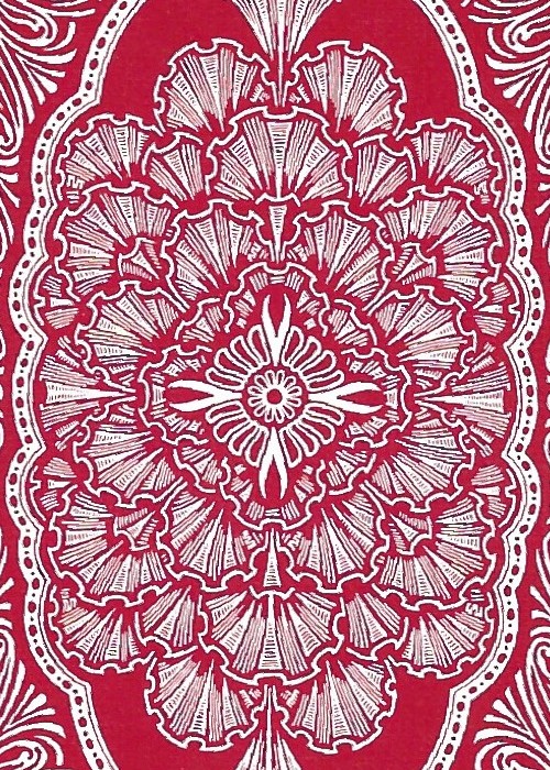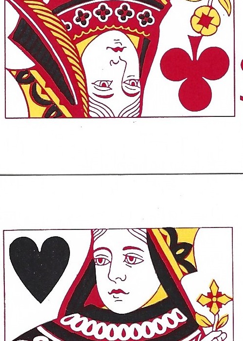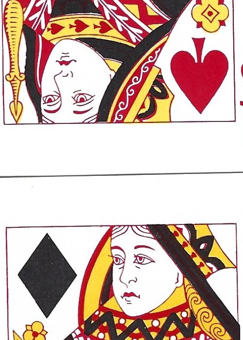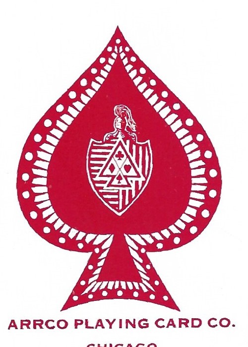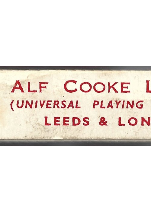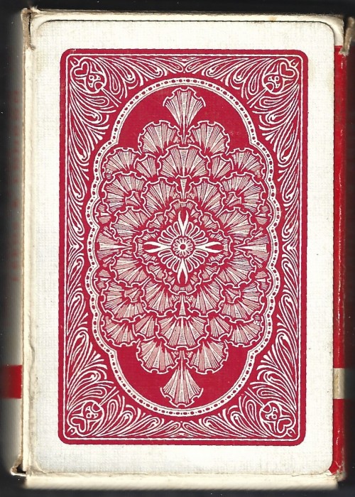 Unusual set of 52 cards, with no jokers. The box states they are British manufacture by Alf Cooke of Leeds and London. The Ace names the Arrco Playing Card Co, Chicago. Made in the USA. Arrco printed a reverse color deck in the 50s and 60s. Magicians and card players with a sense of mischief bought them. (thanks to Chris Turner) The red and black printing is reversed: Clubs and Spades are Red, Diamonds and Hearts are Black. The box cannot be the original. The card stuck on the back is the joker of the set inside. On the side of the tuck box in pencil is written, M/R Deck If this stands for marked deck and the idea was to make it look like an ordinary set, then there doesn’t appear to be any marks on the back of the deck.