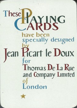 Issued in 1957 on the occasion of the First International Playing Card Week, hosted by De la Rue in London to celebrate the company’s 125th anniversary. https://www.wopc.co.uk/delarue/picart/index