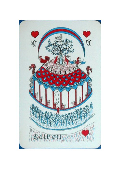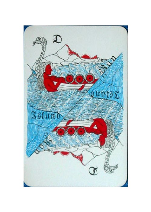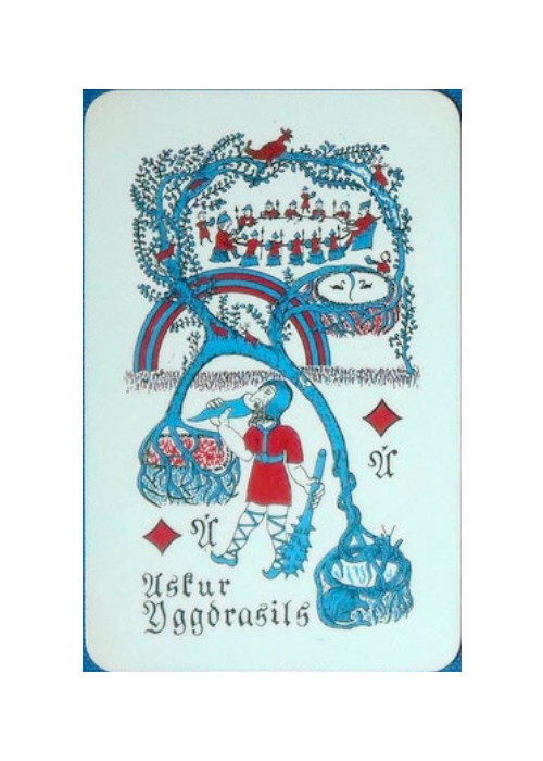 Spil Midgardsormur rare Mythological playing cards of Iceland, designed by Sigurlinna Petursson, printed by Handa of Denmark c1958, deck has 55 cards, 52 poker indiced illustrated cards plus 2 jokers, plus one double sided (red & black) extra card, the deck also has the 8 page ‘Explanation’ booklet with a short bio on each individual character featured on the 54 cards. Cards measure 88mm x 57mm (Bridge size), a wonderful mythological representation of the Gods on each of these non-standard cards.