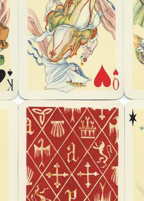 “Romance Español” designed by Carlos Sáenz de Tejada (1897-1957) and published by Heraclio Fournier in various editions since 1951. Carlos Sáenz de Tejada was for many years the artistic director at Heraclio Fournier. The designs feature romantic, fantasy medieval court figures evoking conquest, hunting, music and poetry. https://www.wopc.co.uk/spain/fournier/romance-espanol