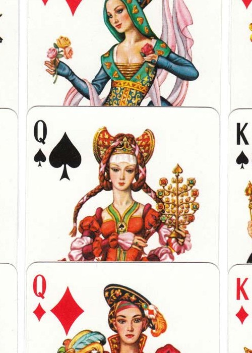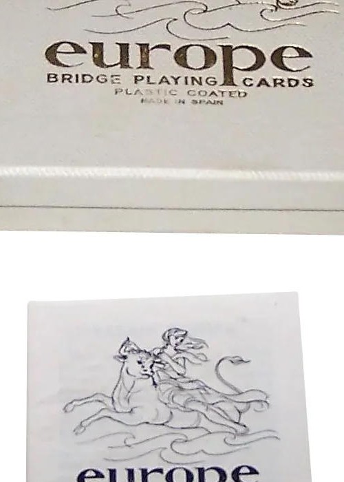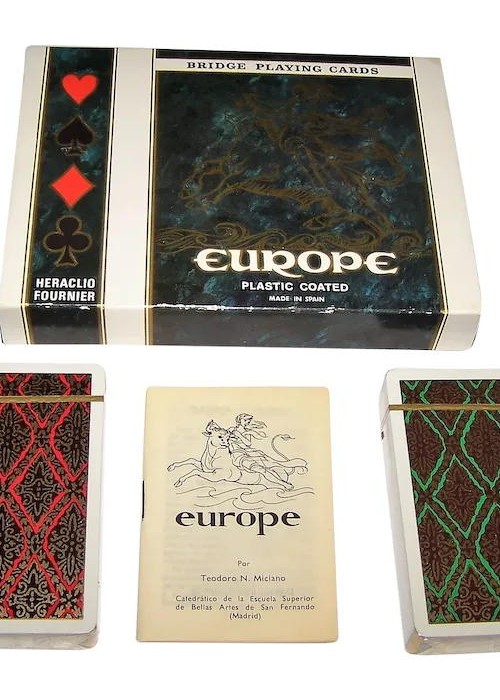 “Europe” was designed by Teodoro Miciano, professor at San Fernando School of Fine Arts, Madrid, and printed by Heraclio Fournier in 1962. This two-deck set was released in at least two different box styles (pictured).