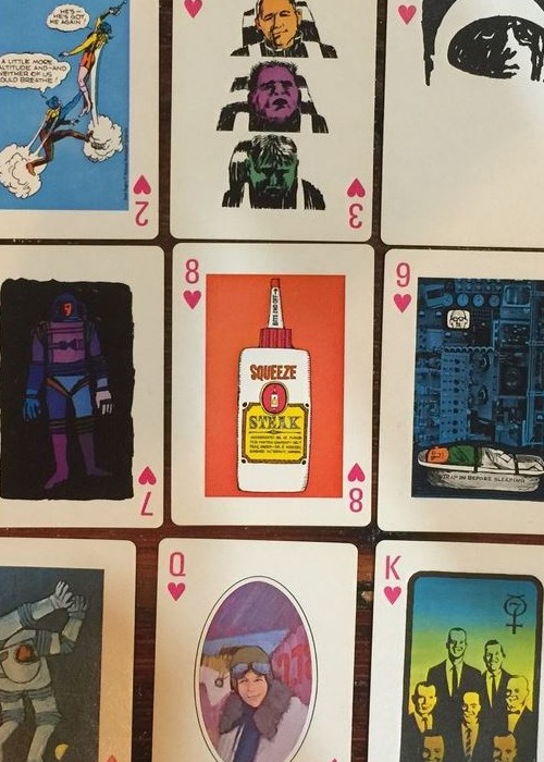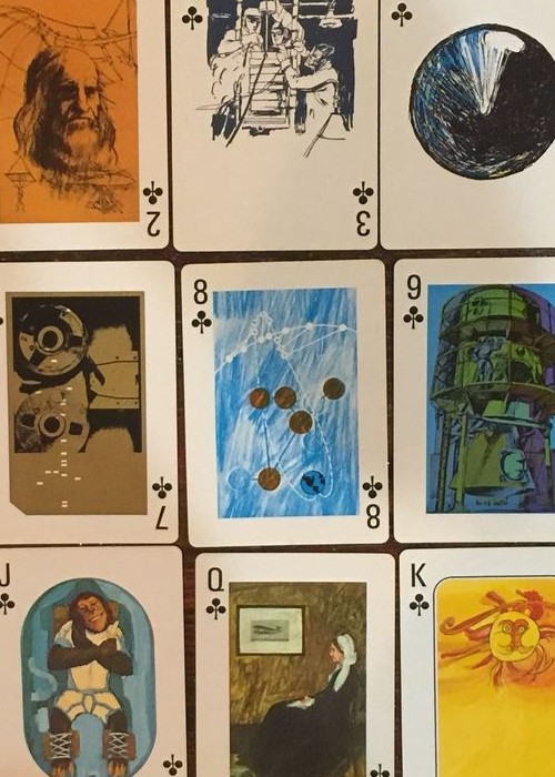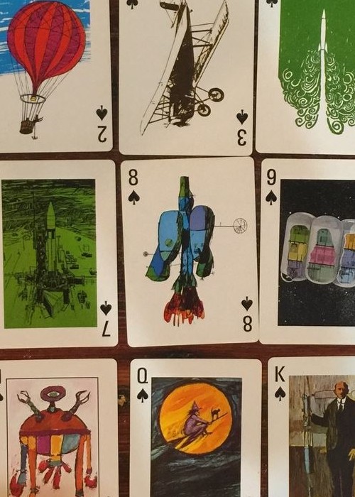 These were printed in 60’s by General Dynamics to celebrate funding for the space program. There are two versions of the deck. One with a light blue card back and one with a red card back. Every card has a different space related image, two jokers and one information card.