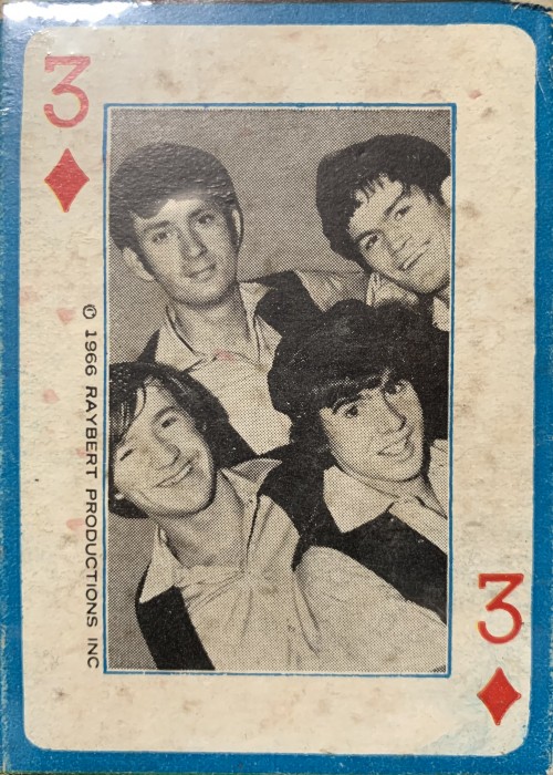 Vintage Monkees Playing Cards – 1966 Raybert Production Inc. Made By Ed-U-Cards Mfg Co. No. 492, Printed in U.S.A. Contains 40 pip cards with official action photos (black and white) of the band, 12 standard face cards, and 2 jokers. Back of cards feature Monkees logo.