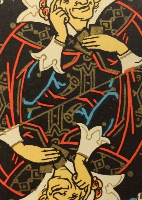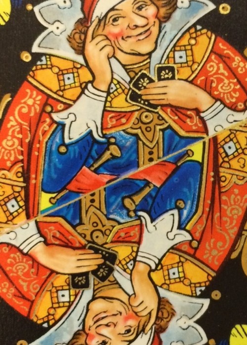 This Black Palekh deck was made by the Leningrad (St.Petersburg) factory of color printing in 1967 to commemorate their 150-anniversary. Originally named as ‘Jubilee’ playing cards these cards became well known as Black Palekh. Art design by the Russian artist Pavel Bazhenov (1904-1941). This particular Black Palekh deck was printed in 1980 (1977 edition).