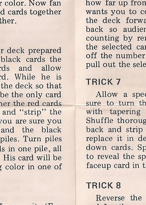 Included is a folded piece of printed paper, dated 1973, with instructions on a series of magic tricks to perform with this Tapered deck. I can not locate any residue from a past seal. So, this deck may or may not have had one.