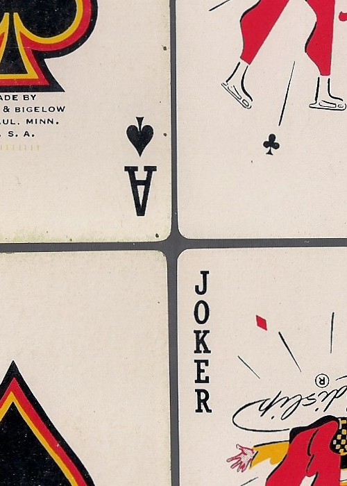 Double deck bridge set. Outer case advertises Eastman Dyes and Textile Chemicals. Also states New Orleans 1974. Backs of cards are paintings of boats and harbor scenes. Paintings by Lionel Barrymore.