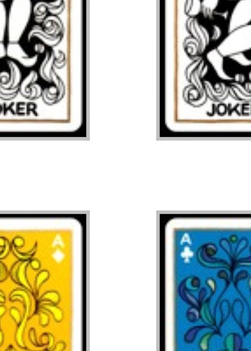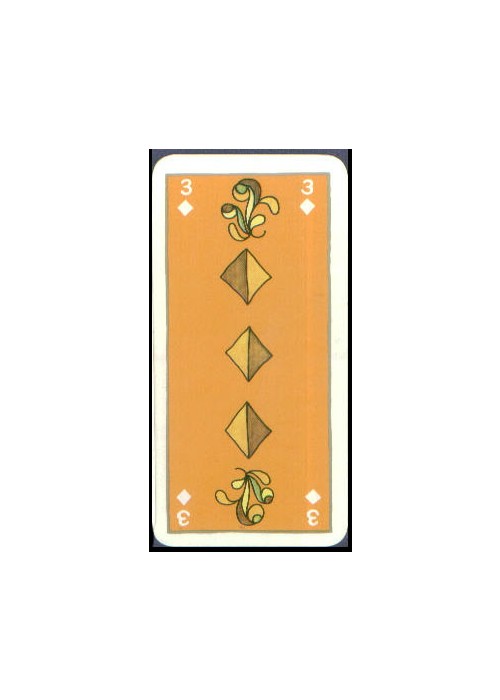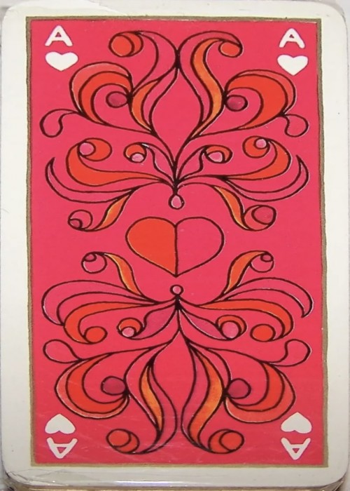 Made by Coeur and brilliantly designed by Hannelore Heise, called “Bacchus.” According to the World Web Playing Card Museum (WWPCM #03927), there were 2 editions of this deck, published in 1974 and 1986, and the First Edition has gold gilt around the whole of the cards, not just at the corners. The deck has 52 suited cards, plus 3 Jokers. The cards are an unusual shape, long and thin, measuring 100mm x 50mm, with gold gilt around.