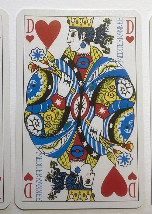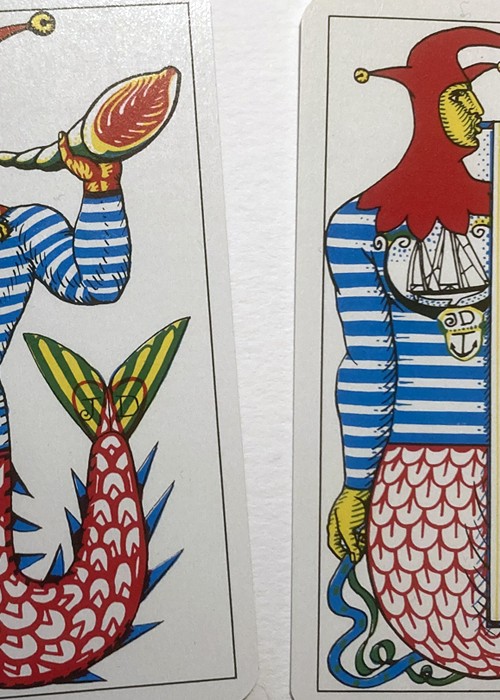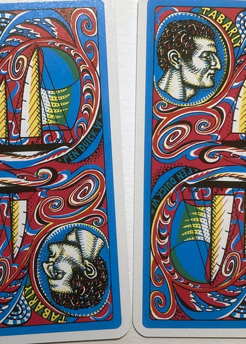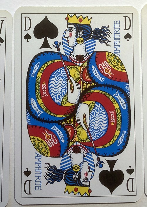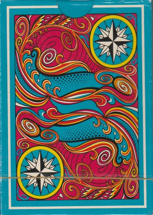 Printed by Grimaud c.1976, Les Grands Navigateurs. The cards feature wonderful original designs on the backs, Jokers, Aces and court cards by artist Jean Delpech that depict famous figures concerned with navigation, both real (Columbus, Magellan, Drake, etc.), and mythological (Neptune, Amphitrite), and famous places (Cape Horn, Indian Ocean). Included is a folded insert describing the persons and places shown.