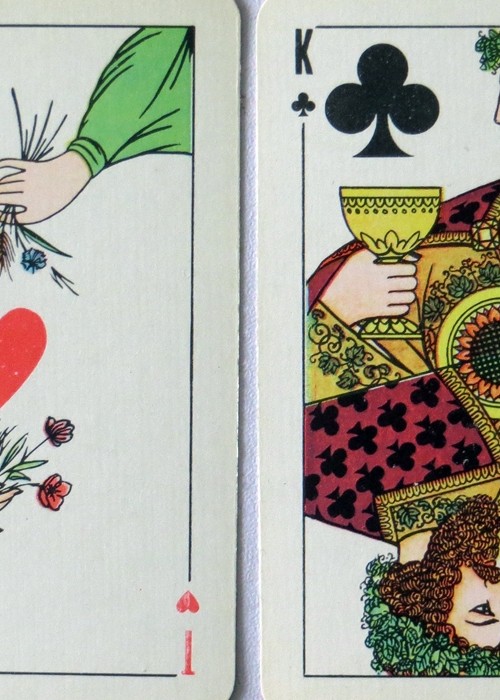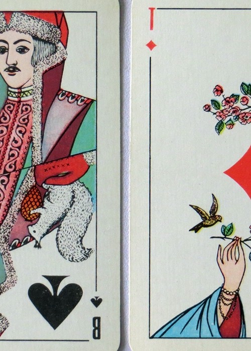 From ‘The world of playing cards’ :Originally titled “Seasons” or “Times of the Year” and first published by The Colour Printing Plant in St Petersburg in 1971, these cards were designed by artist U. P. Ivanov. Each suit is allegorical of one of the four seasons of Winter, Spring, Summer & Autumn.