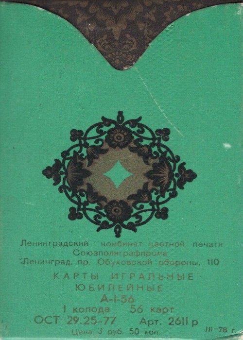 This is 1978 reprint of the famous Soviet Palekh deck. Art by Pavel Bazhenov. This masterpiece was printed for the first time in 1937. The first reprint (Jubilee/Юбилейные) was issued in 1967 to commemorate 150 years of the Leningrad’s Printing Plant (Kombinat Tsvetnoy Pechati).