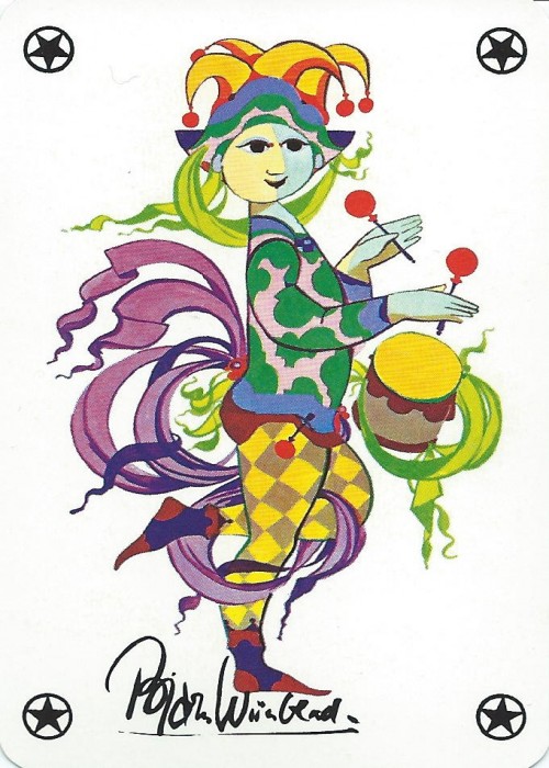 Danish artist and designer Bjorn Wiinblad (1918-2006), who is probably best known for his ceramic work for Rosenthal and Nymolle porcelain company, designed these colourful playing cards which were produced by Piatnik in the late 1970s. https://www.wopc.co.uk/denmark/bjorn-wiinblad