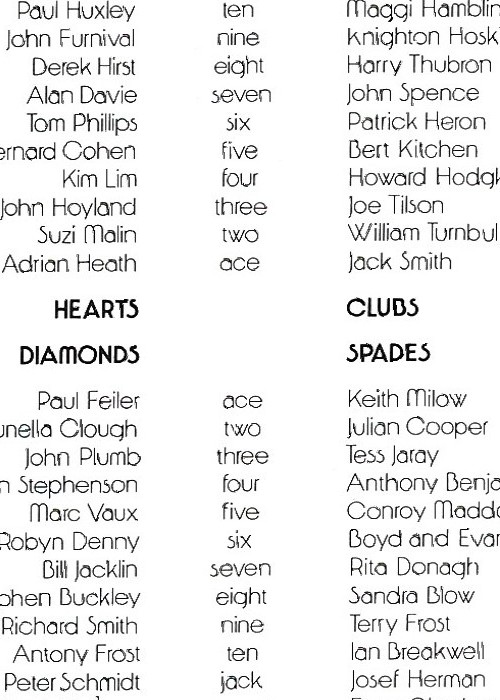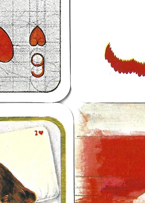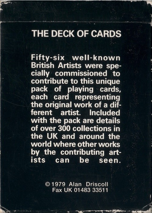 56 different artists contribute their own take on 52 cards, 2 jokers, a back design and the box. The set contains a small booklet listing the artists and galleries across the world were their work can be seen. One additional card lists the artists against the specific card they have created. A further card reproduces the back design on one side and the box design on the other.