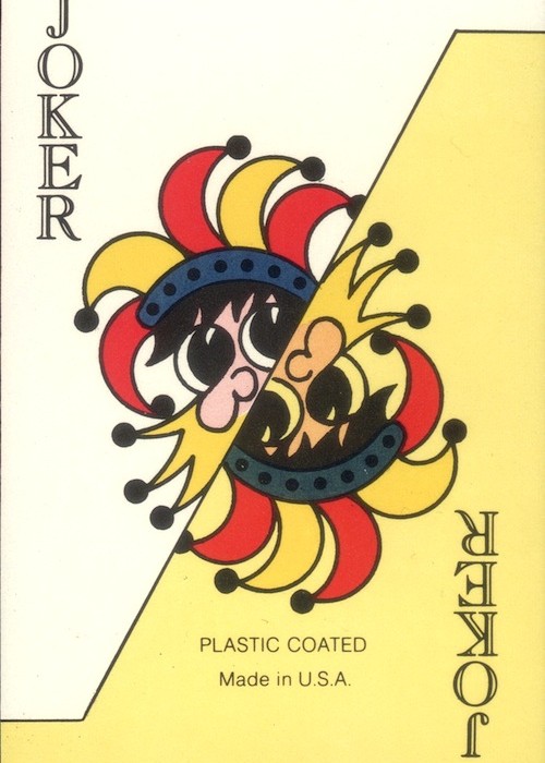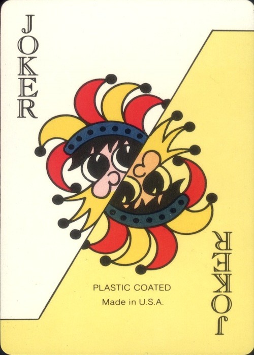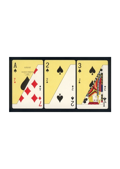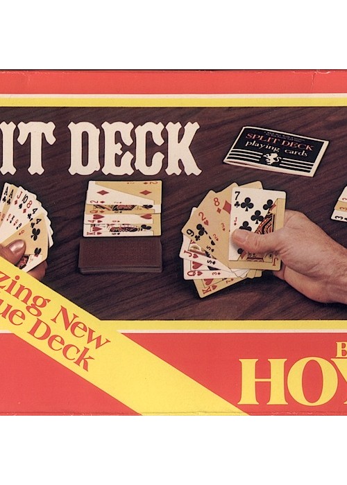 Designed by Herb Hancock of Ontario, Canada. Published by Stancraft Products of St. Paul Minn., under the brand name Hoyle. The Split Deck Playing Cards box includes two split decks, one with red backs and one with blue backs, and a rule book explaining how to adapt several games for use with the split decks: Bridge, Cribbage, Rummy, Hearts, Poker. When holding a hand of several of these cards, they can be fanned out to show the white halves, or rotated and fanned out to show the yellow halves instead. These will be two very different hands.