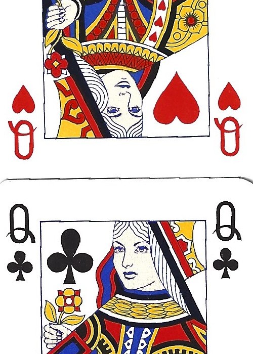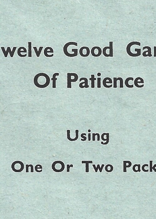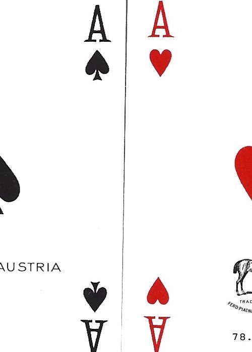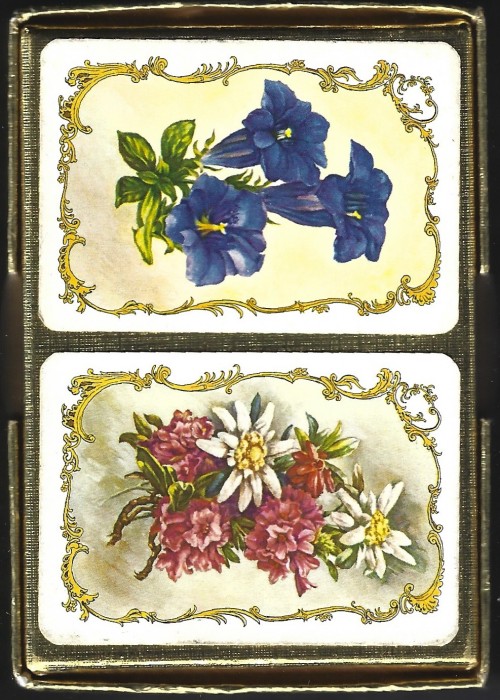 Two decks of half poker size cards, each deck with a different floral design motif on the back. Each deck consists of 56 cards: standard 52 card deck, 3 jokers, 1 Makers name card. A sixteen page booklet called Twelve Good Games of Patience published by Benno Partners accompanies the set. The box is a gold foiled lidded sturdy cardboard box, with a thicker carded vinyl patterned covered piece on top. Two of the aces feature further detail: Ace of Spades states, Made in Austria, Ace of Hearts carries Piatnik stamp.