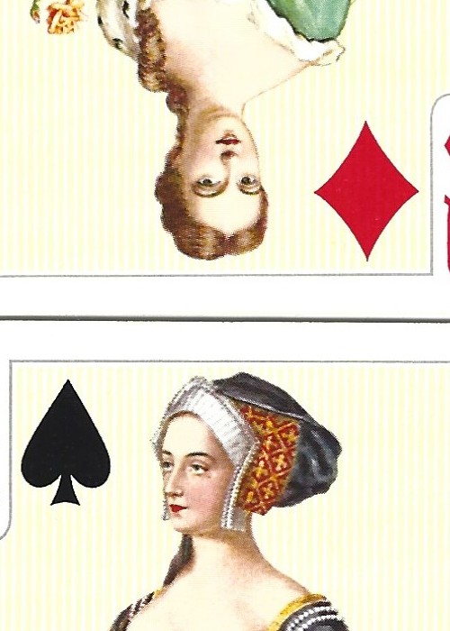 A double set of cards made by Piatnik and distributed in the Uk by Benno Products, circa 1980. The backs depict the House of York and Lancaster Roses, white and red. The 12 court cards are twelve royal or political figures. The same appear on both decks. There are 3 jokers per deck. The aces are decorated florally.