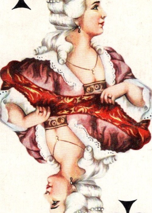 80’s edition of the Rococo deck, which was designed back in 1911 by Dondorf’s plant for the Russian emperor. The box of this edition is generic and was used to many other different Soviet decks. The name on the box is Souvenirnye (Souvenir Playing Cards). The colors and the detail of the courts is inferior compare to the 70’s edition.