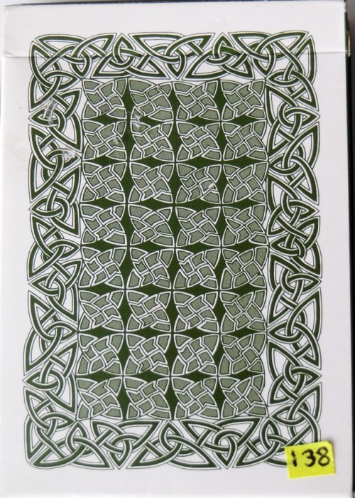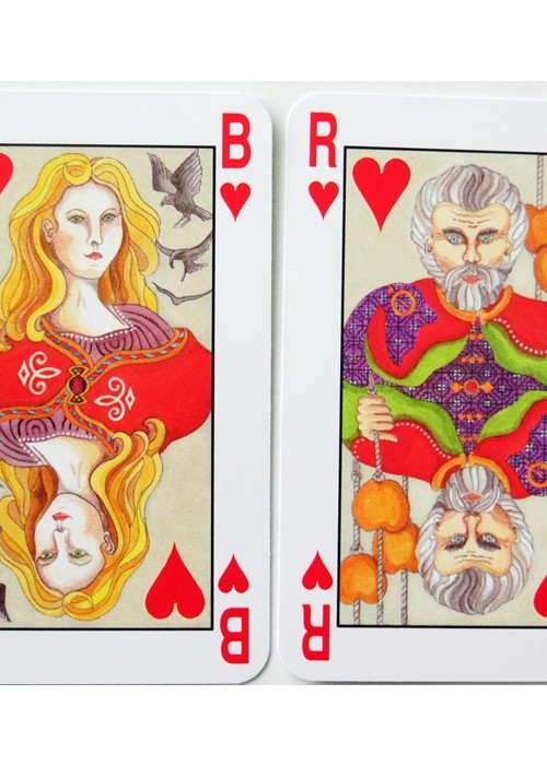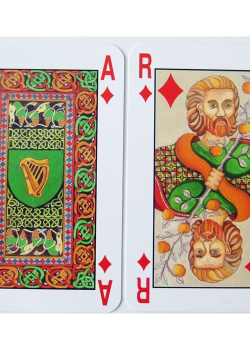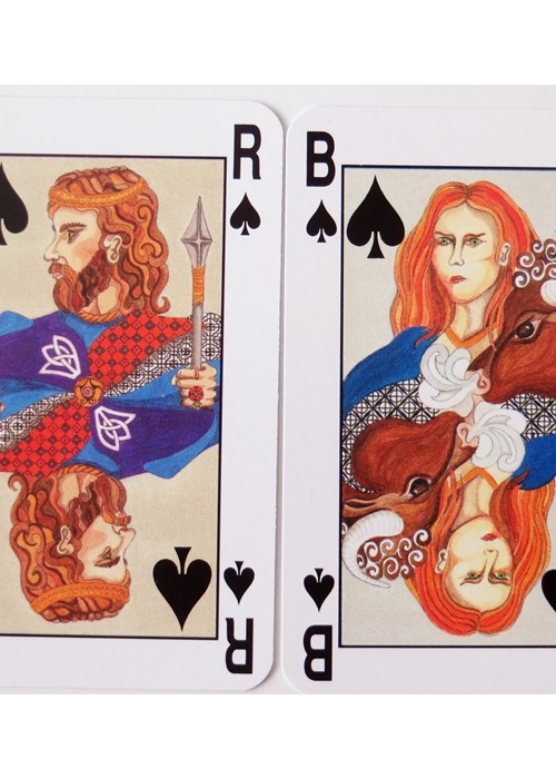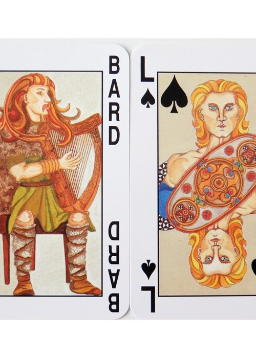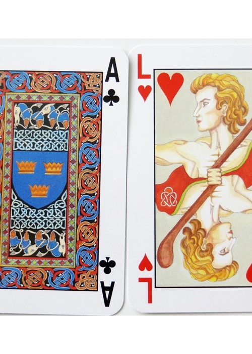 The pack features some of the well known figures in the legends of Ireland. The four suits represent the four provinces of Ireland and the shield of each province is on the Ace of each suit. Gaelic terms have been used – R(i) = King, B(ean)= principal woman, L(aoch)= chief warrior. The Gaelic Bard takes the place of the Joker.