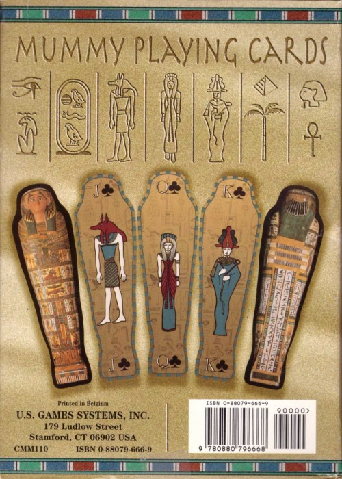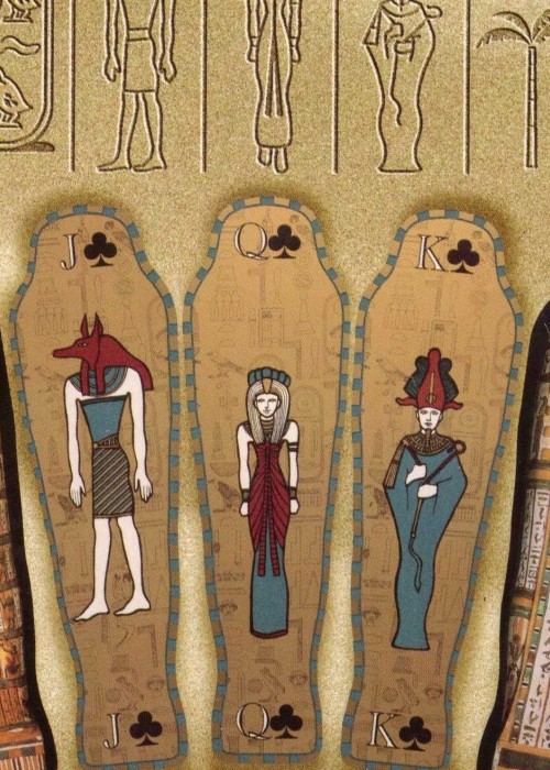2 Decks of 52 cards, one intro card and 2 jokers in the shape of Egyptian sarcophagi, produced by the Boston Museum of Fine Arts. Presented in a faux leather black hinged case, with a gold lined edge. The case is reccessed in the same shape, with each deck held in place with an elastic band and a ribbon. One decks back has the front of the sarcophagus, the other shows the back. The aces and courts have a repeated desigtn on them. (i.e. 5 designs across 4 decks) The same pattern is on 2-10.