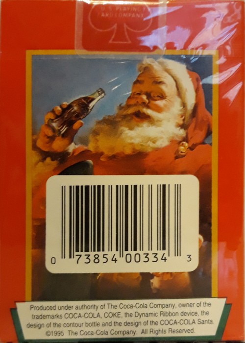 Every year from 1931 until 1966, Haddon Sundblom created a painting of Santa Claus for the Coca-Cola Company. This Santa painting was created in 1950 for an advertising campaign. This Coca-Cola Santa Claus playing card and tin set was produced in 1995 by the U.S. Playing Card Company.