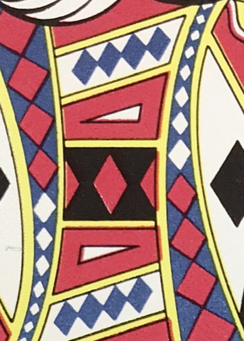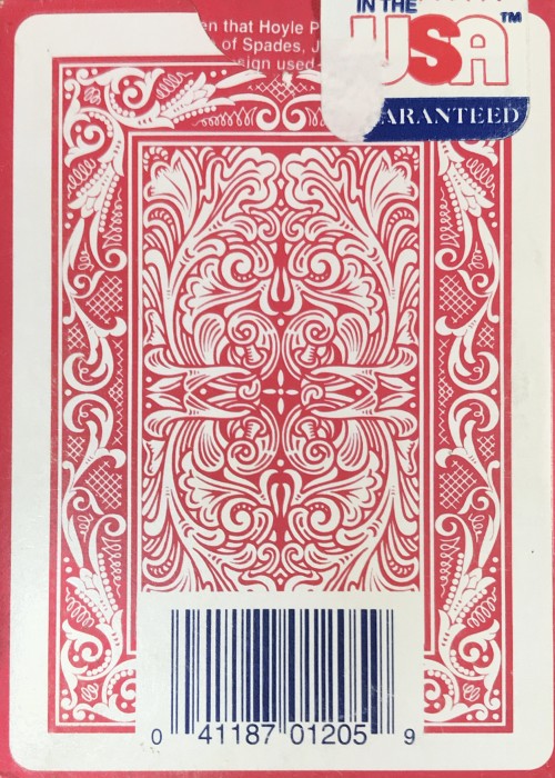 Maverick red with slightly different box back. Includes a UPC barcode without Hoyle notice. The notice is on the flap of the box. Style No. 1205 printed on bottom of box.