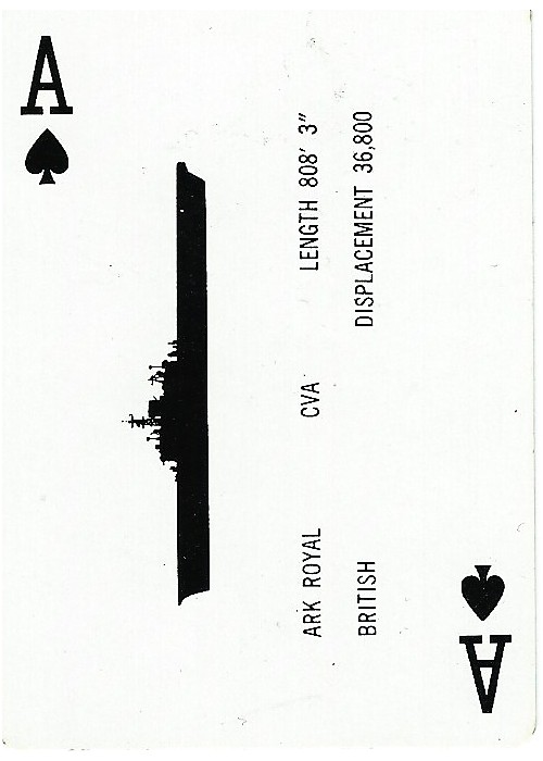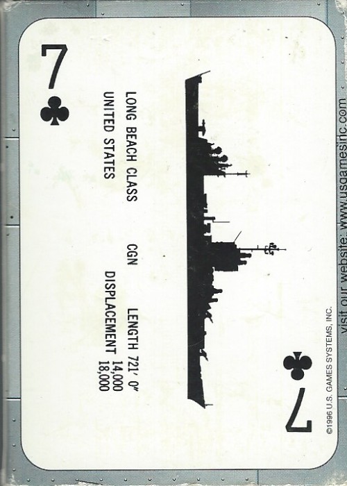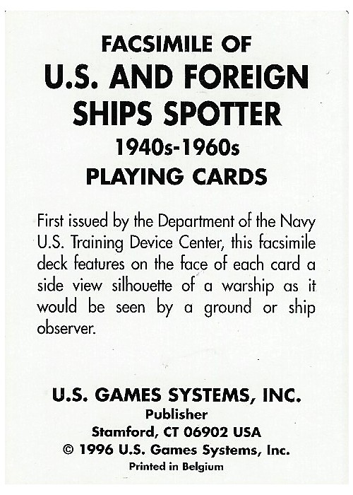 Facsimile of U.S and Foreign Ships Spotter 1940’s-1960’s Playing Cards. First issued by the Department of the Navy U.S. Training Device Center, this facsimile deck features on the face of each card a side view silhouette of a warship as it would be seen by a ground or ship observer. Printed in Belgium.