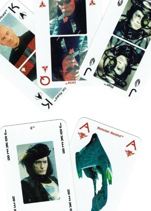 You can see a video of the entire deck here: https://youtu.be/v_bpD2AhlKA Daniel Vollmer, from Germany, licensed these Star Trek cards to Paramount Pictures. Tricorder Records in Germany produced two versions of STTNG playing cards. One is a boxed set of 2 55-card decks and the other is a single deck poker deck. This is the 2 decks version which consists of 55 playing cards each: 2, 3, 4, 5, 6, 7, 8, 9, 10, Jack, Queen, King, Ace and 3 Jokers. The four colors are: Federation, Klingon, Romulan and Borg. Images show crew, ships and aliens and are different between the two sets. There is a somewhat inconsistent pattern to the cards. Aces are ships. Jacks are characters like Data and Hugh, Queens are women (except for one male Borg), Captain Picard and other Commanders are Kings and the Jokers are Q. The sets were released in 1996.