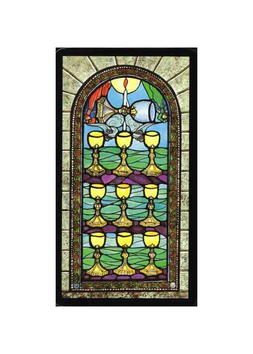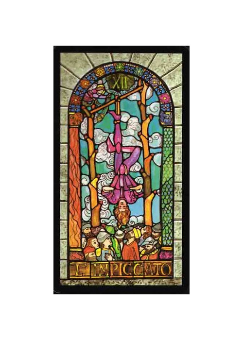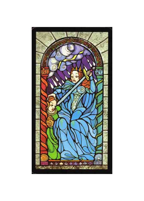 The Tarocco delle Vetrate is a stunning, gloriously coloured Tarot from Luigi Scapini, artist of the Medieval Scapini Tarot and Shakespeare Tarot. The minors are generally pip-style cards, but some are very scenic. Though the cards have Italian titles, the companion booklet has a section in English.