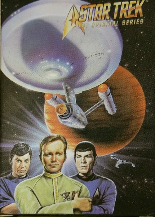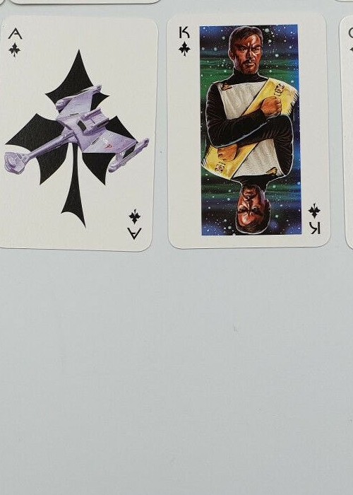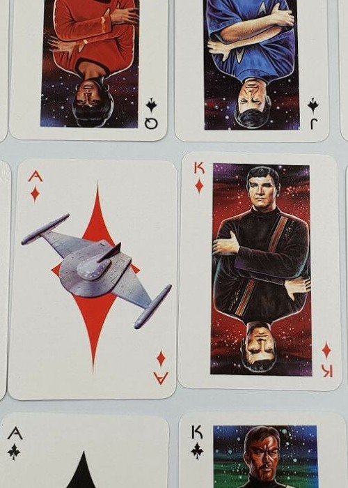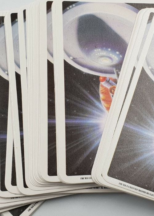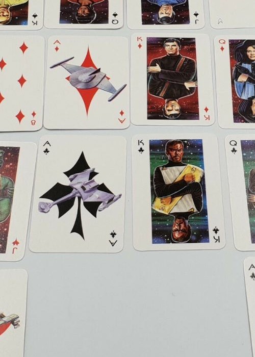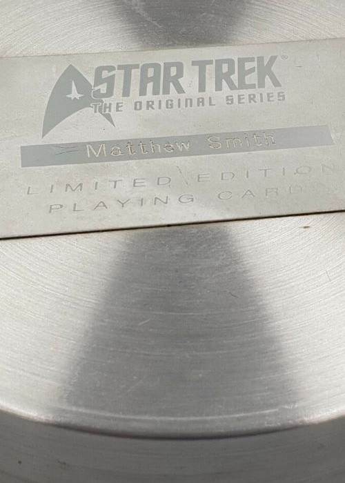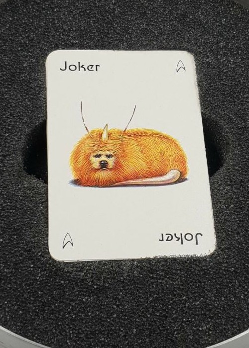 In the 1980-90’s, Cinema International Corporation (CIC) was the licensed distributor of Star Trek home video in the UK, Germany, Australia, and other countries. In 1996, they created a promotion where playing cards were included with specially-marked Star Trek videos. If you bought all of the videos, you would be able to assemble a complete deck. As part of the promotion, you could order a personalized round tin (made to look like a movie reel tin) to hold the cards. Two years later, in 1998, CIC continued the promotion in Germany by offering complete decks of the cards. The cards show a starship on each of the aces, and characters from the show on the face cards. The Jokers are an Alpha 177 Canine and a Tribble. The deck itself can be difficult to find, but the rarest object is the personalized tin.