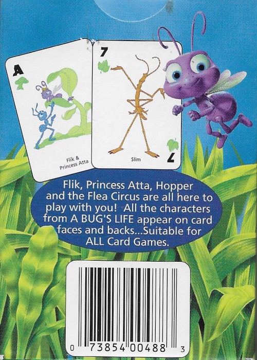 A Bug’s Life licensed deck with 2D cartoon versions of characters on the cards. Suits are unique: acorns, bugs, leaves, and mushrooms.