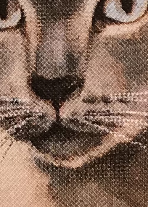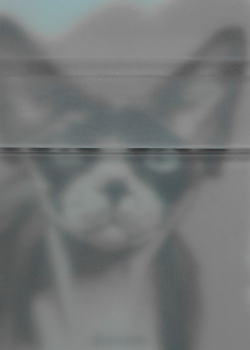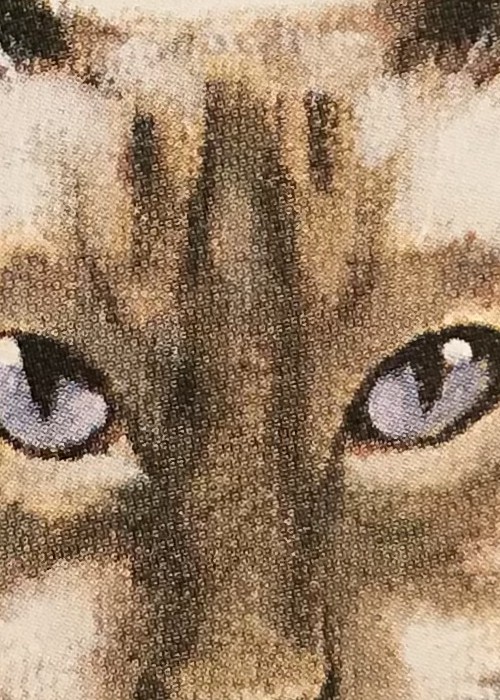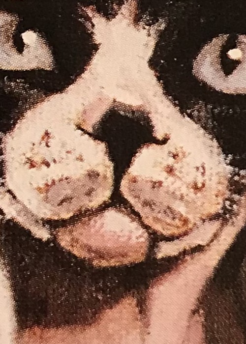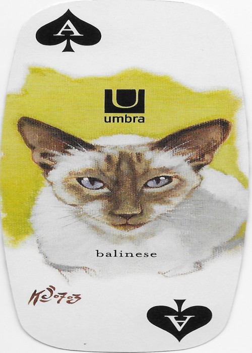 Long, slender oval-shaped playing cards with different cat paintings on every card.