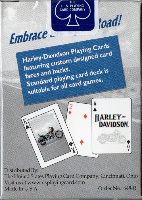 Officially licensed Harley Davidson deck. Along with the Heritage Softail deck as seen here (https://portfolio52.com/deck/1571/view), it was also sold in a 2 deck collectible tin.