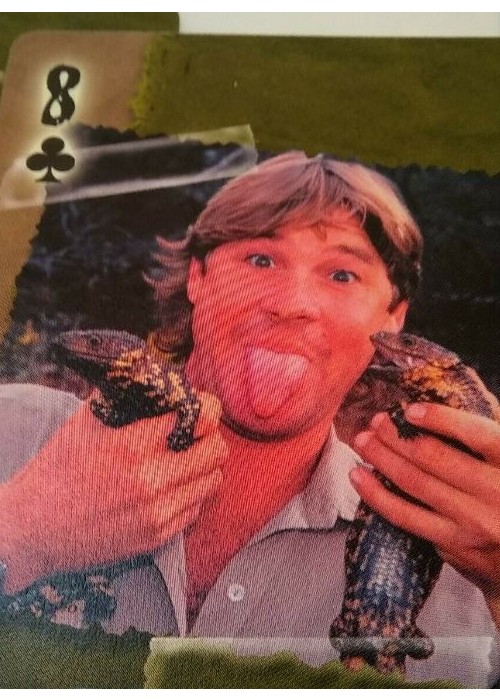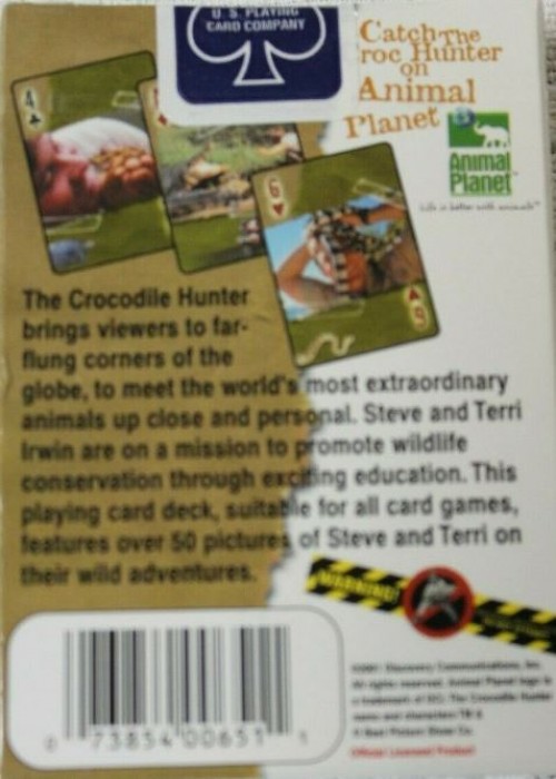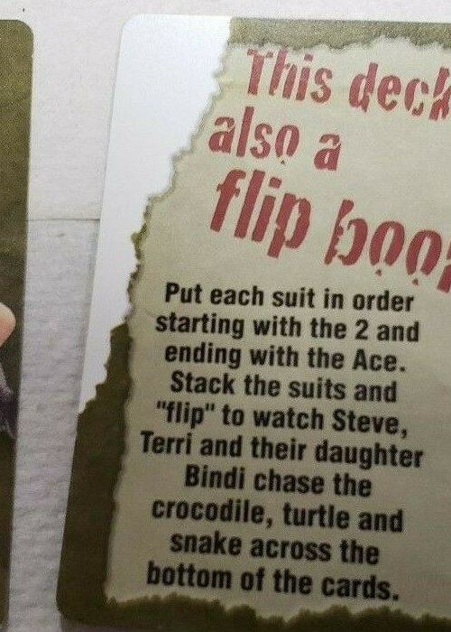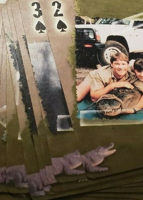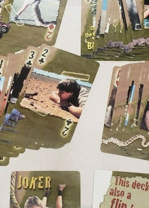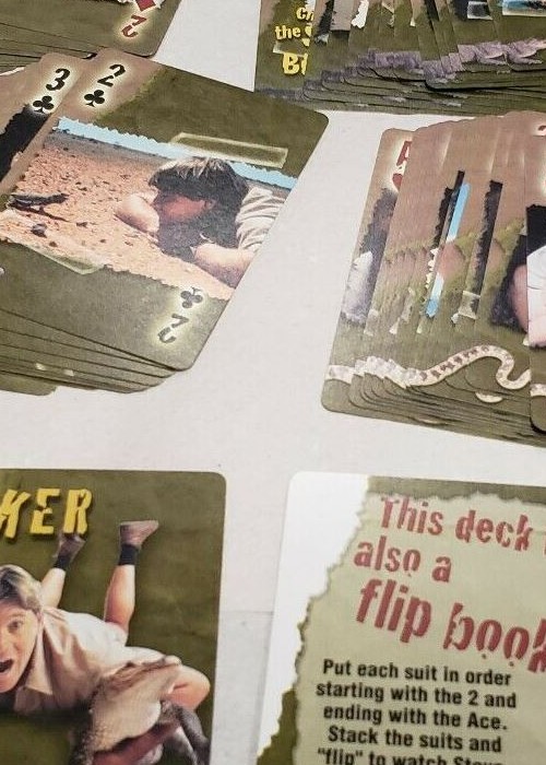 The Crocodile Hunter playing cards. Reminisce the amazing life of Steve Irwin with this photo filled deck of cards. It features a Flip Book feature that makes it appear as though the animals are moving across the cards. See a video of the entire deck here. https://youtu.be/ElnbeYl94dE