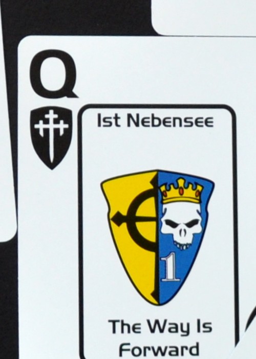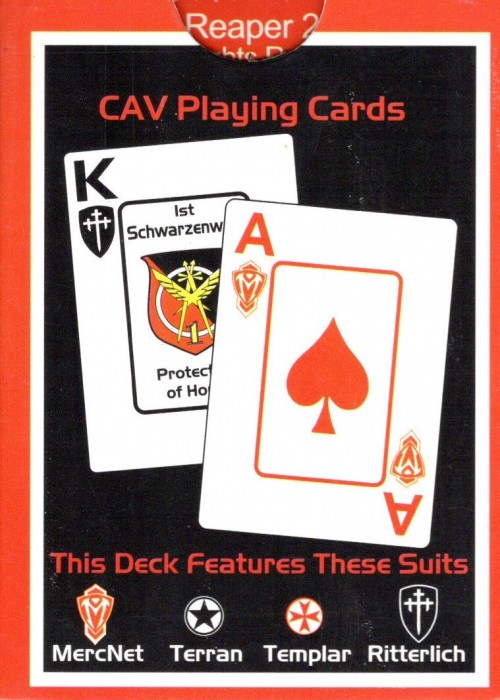 CAV (Combat Assault Vehicle) Playing Cards by Reaper. 2002. Red deck featuring the following Suits: MercNet, Terran, Templar and Ritterlich.