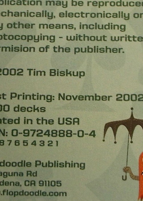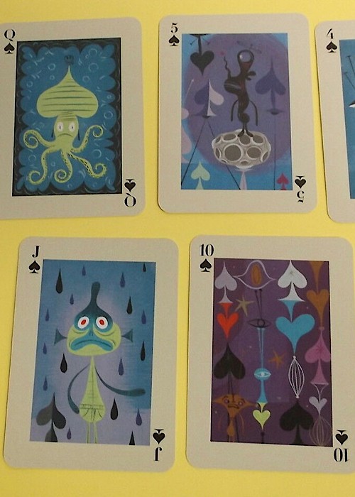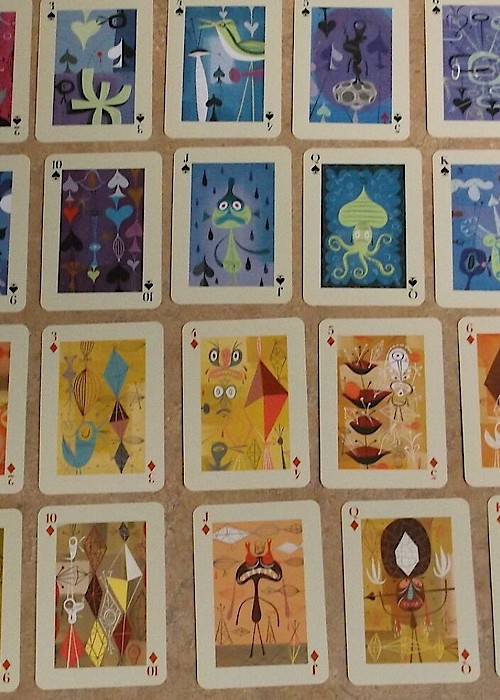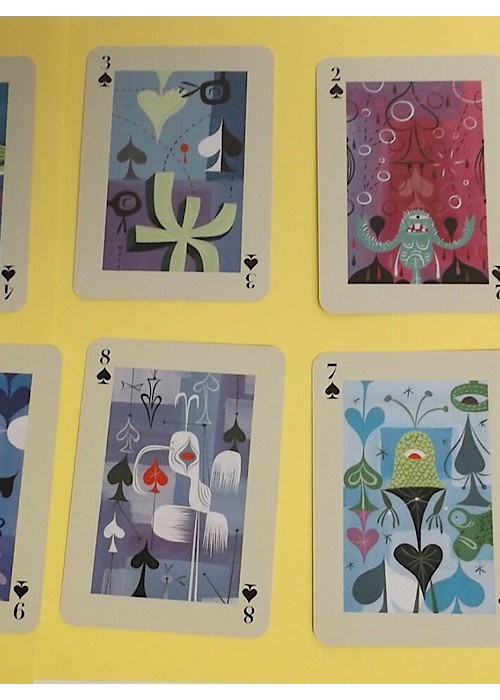 TIM BISKUP (b. 1967, CA), ‘Lucky Stack (The)’, 2002 (1st edition) This is a casino quality poker deck of 52 playing cards by artist Tim Biskup. Every card has a terrific reproduction of one of his paintings. The Lucky Stack is sure to bless you with good fortune on your next poker night. Each and every card has a unique face, rendered in Biskup’s colorful and whimsical style. Tim Biskup has successfully created a unique and widely recognizable style out of the marriage of comic book illustration, graphic design, and abstractionism. His graphical, multilayered works are precise and colorful while expressing movement and intensity. Biskup’s dense, character driven style is inspired by mid-century modern design infused with a healthy dose of punk rock energy. He classifies his style as ‘Baroque Modernism’ due to its infusion of modernism and ornate, detailed patterns. A main influence of Tim’s is Mary Blair, a designer who worked for Walt Disney for 37 years and is best known for her work on the Disney animated films Alice in Wonderland and Peter Pan. Since entering the Lowbrow scene in the late 90’s, Tim’s artwork has evolved at a break-neck pace. He has extended his aesthetic influence into print, media, clothing and many other arenas while creating works for galleries and maintaining focus as a painter. He’s collaborated with artists Mark Ryden and Gary Baseman and organized art auctions and exhibitions. His highly sought after original paintings and sculptures have been shown worldwide, including galleries in Los Angeles, New York, San Francisco, Tokyo, Kyoto and Melbourne.