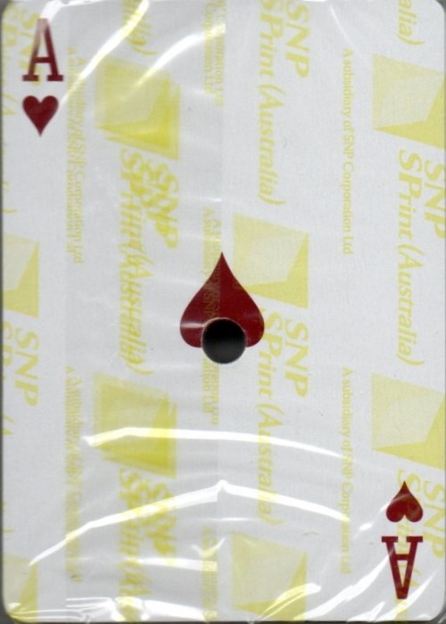 SNP Ausprint Pty Ltd was formerly part of Singapore National Printers (SNP). The company had several changes of name, which were printed on the joker cards more→ Brand names include ‘Ausgold’, ‘Unicorn’, ‘Players Choice’ and numerous decks for casinos. They printed a few special decks/jokers including Dewar’s, the Karen Curran Enchanted Journey, Holden, Toyota, Versace, Triple M and Avon Graphics. The company went into receivership in April 2008. See full set of court cards here→ Versace playing cards for Versace by SNP Ausprint Pty Ltd Above: “Player’s Choice” playing cards for Versace with 2 Matta jokers, by SNP Ausprint Pty Ltd, c.2000. There was a Versace exhibition held here in August in that year. Courts are standard, with large corner letters. Dewar’s playing cards for Dewar’s by SNP Ausprint Pty Ltd Above: special playing cards for Dewar’s by SNP Ausprint Pty Ltd. Triple M Radio playing cards for Triple M by SNP Ausprint Pty Ltd Above: “Triple M” playing cards for the networked radio station by SNP Ausprint Pty Ltd. Other Advertising advertising playing cards by SNP Ausprint Pty Ltd Above: advertising playing cards by SNP Ausprint Pty Ltd. In earlier times it was possible to get ‘casino used’ cards direct from the casinos themselves, with either a hole drilled or corner cut, but recently they have stopped doing this. Some have cards printed with the casino advertisement on the back that you can buy at their souvenir shops, but they’re not used in the actual gaming rooms.