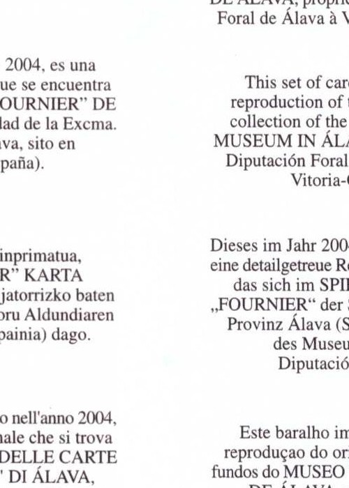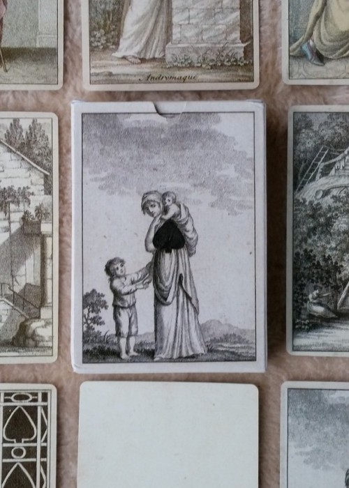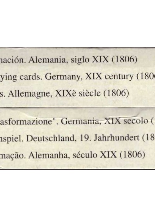 2nd in a series of annual decks (printed in almanac format) published by J. C. Cotta, this transformation deck features characters from classical antiquity (Greek myths) with French captions and was originally published in 1806. This 2004 printing by Diputacion Foral de Alava is a reproduction from the original as found in the Fournier Museum. Identifier/stock number 30NAI006 printed on the bottom of the deck.