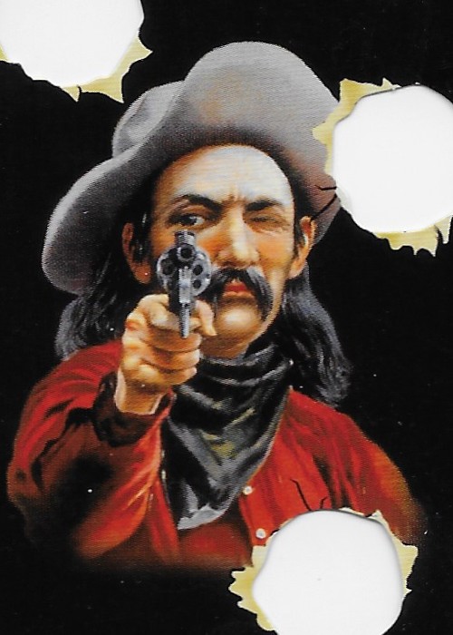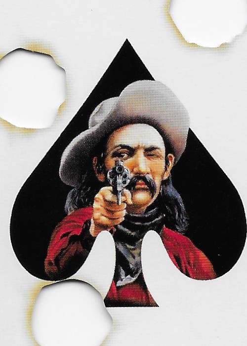 Deck with 3 bullet holes die cut into cards, slightly larger than poker deck. Same court images each suit.