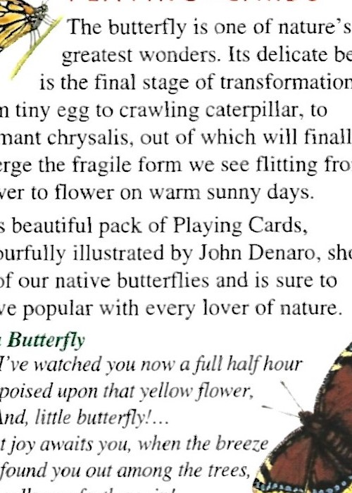 Heritage Playing Card Company is a UK based firm, who’s tag line is See the world in your hand! Since starting in 1992, they have produced many sets of card, not only for the UK, but France and Germany too. Always full colour, with 54 images. This butterfly deck, has had changes over the years. (see gallery for the 1999 box) The card back design has also changed. One in gallery is also from 1999 Link to current pack http://heritageplayingcards.com/index.php/english-titles/animal-kingdom/butterflies-of-the-world.html Cost £4.95