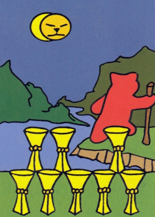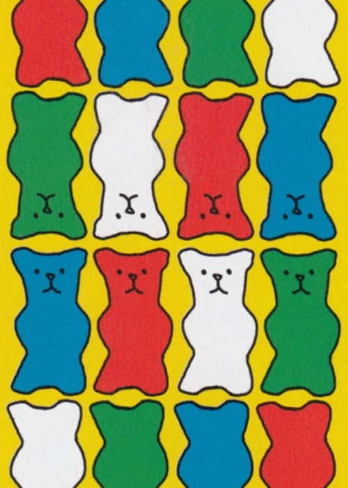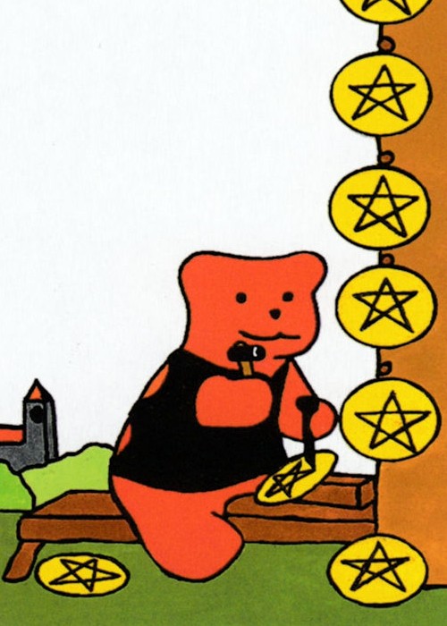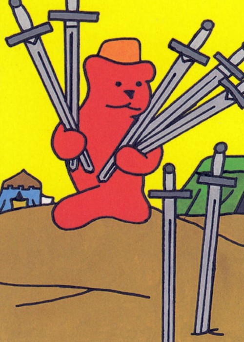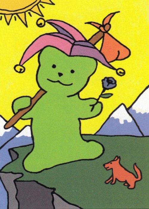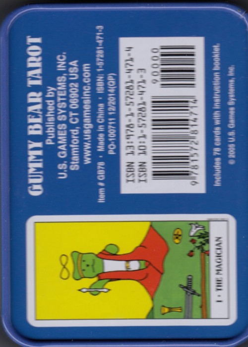 The Gummy Bear Tarot has cards in Rider-Waite style, featuring those chewy lollies, Gummibears. The deck was originally published in German as the Gummibear Tarot, but the English version – with English titles