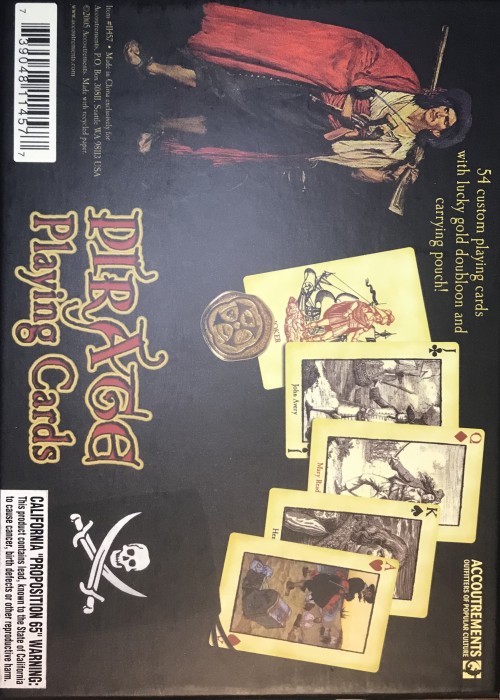 A collector’s edition pirate playing card set. Box measures 8 1/8” x 5 3/4”. Includes 54 custom playing cards, a lucky gold doubloon, and a carrying pouch.